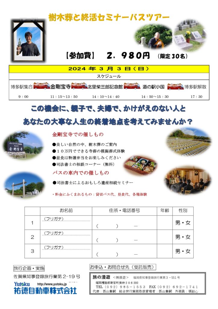 終活バスツアーチラシ2024(旅の漫遊制作) Published on 2024/02/09 in 【福岡発】天空陵の魅力を堪能できる「終活バスツアー」が開催されます。Full resolution (1240 × 1755) Next →